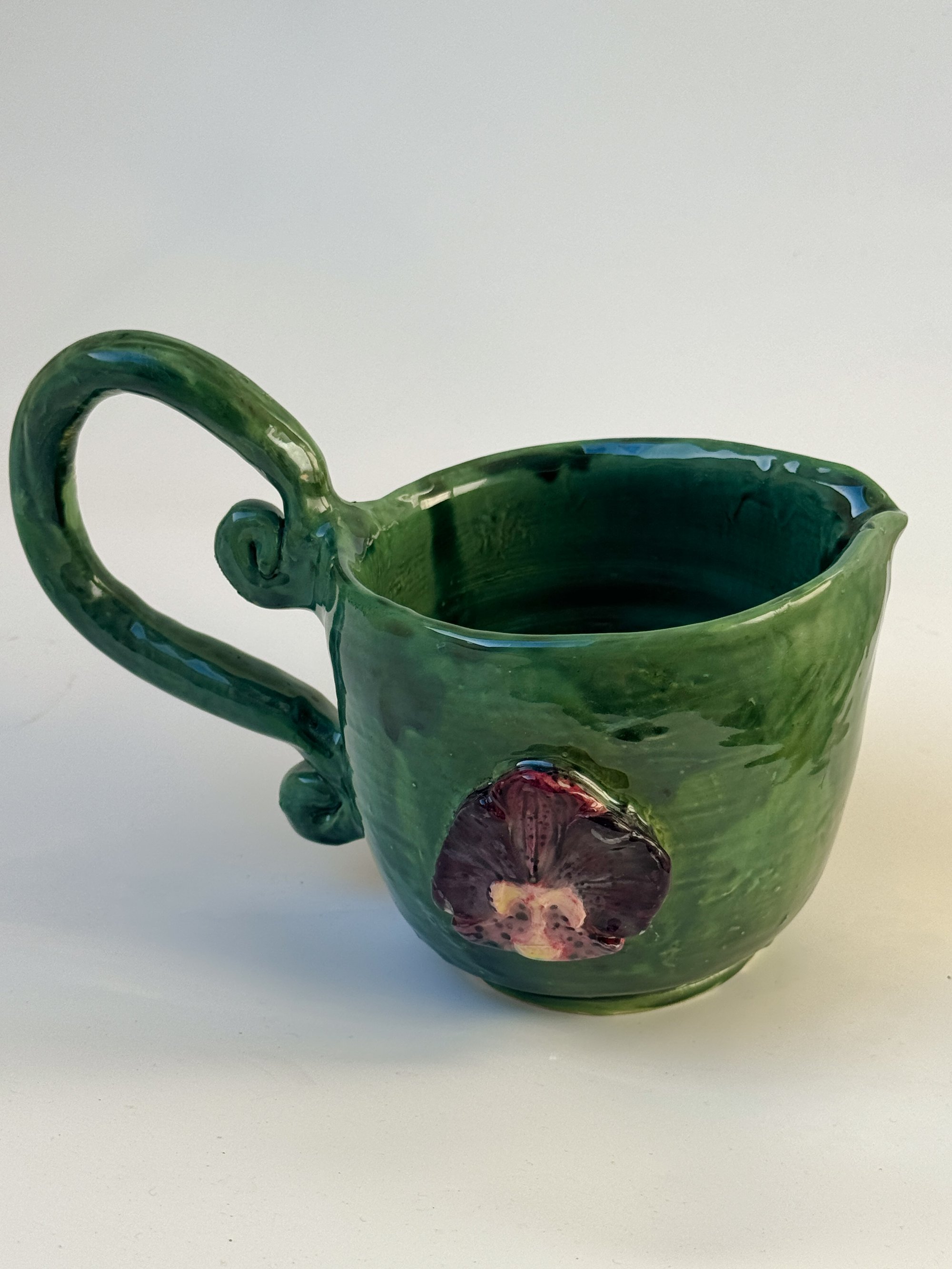 Handmade earthenware ceramic jug featuring orchid-flower detailing. Each piece is wheel-thrown and hand-sculpted, giving every mug its own unique character and organic charm.