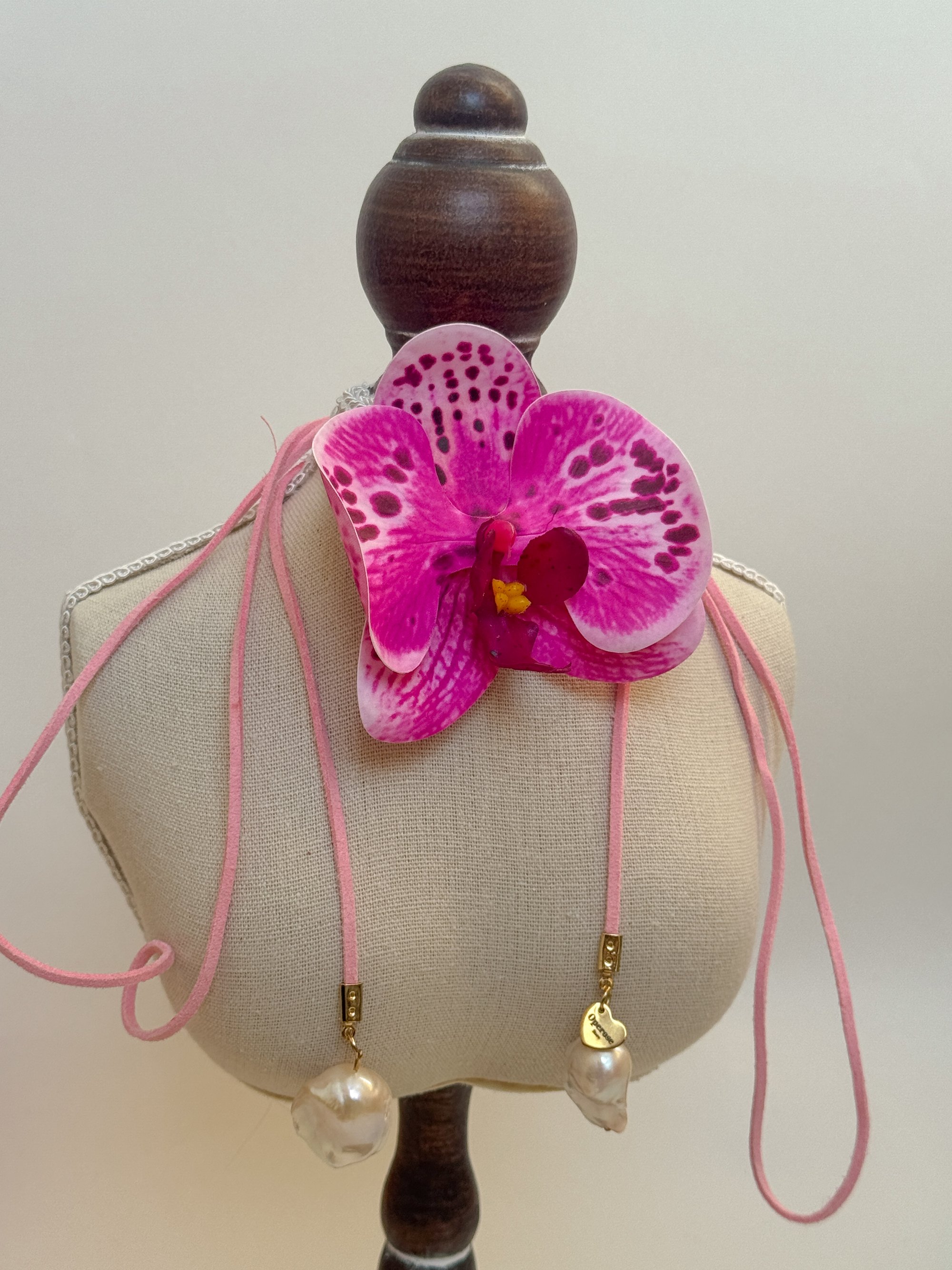 Hand crafted orchid flower choker. strung upon a faux suede string with natural baroque pearls & 18k gold plated stainless steel detailing.